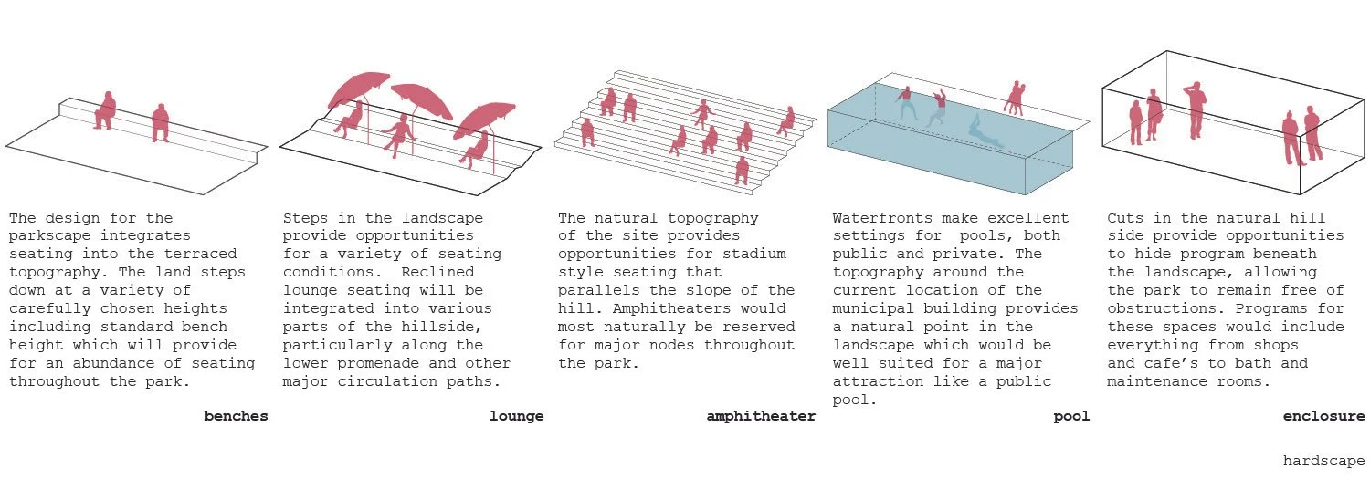 Terraced Public Pool: A signature feature of the park, the multi-level public pool offers panoramic lake views and accommodates both active swimmers and casual bathers, with integrated seating and sun decks.